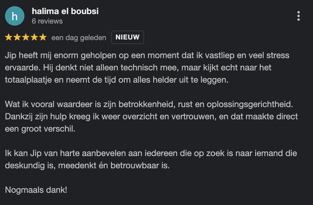 Je krijgt namelijk maar liefst een 1 maand toegang tot Jip voor jouw vragen via whatsapp support. Zo weet je zeker dat je nooit vast komt te zitten en je deze cursus tot een succes kunt maken voor jouw bedrijf.